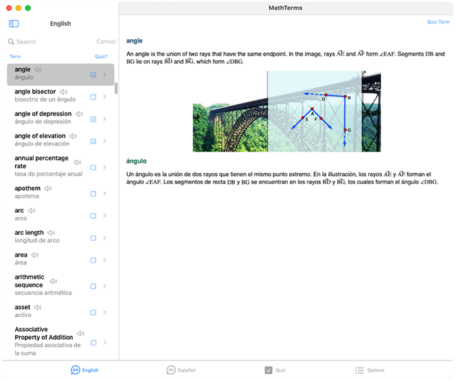MathTerms is an illustrated glossary of mathematics terms in English and Spanish. It is available for iOS and macOS and runs on iPhones, iPads and Macs.  The app includes 500 entries for middle- and high-school mathematical concepts. To help learners master speaking as well as reading, it encompasses audio pronunciations of terms, by English and Spanish native speakers. A flash-card quiz game is included, enabling students to study selected terms in an interactive environment. Once downloaded, no internet connection is required for use.